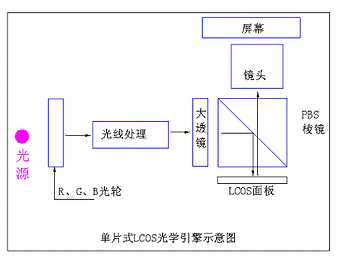 三片式LCD板投影机原理是光学系统把光源发射的强光通过分光镜形成R、G、B三束光,分别透射过R、G、B三色液晶板;控制信号源经过A/D转换调制后,加到液晶板上,通过控制液晶单元的开启、闭合,从而控制R、G、B三色光路的通断,然后三色光经过合色光路,在合色棱镜中汇聚,最后经透镜投射后,在屏幕上形成彩色图像。     3、 DLP背投技术     DLP(Digital Light Processing)指数字光处理技术,这种技术要先把影像讯号经过数字处理后再投影出来,其投影显示质量很好。与LCD背投的透射式成像不同,DLP为反射方式。其系统核心是TI(德州仪器)公司开发的数字微镜器件—DMD(Digital Micro mirror Device),DMD是显示数字可视信息的最终环节,它是在CMOS的标准半导体制程上,加上一个可调变反射面的旋转机构形成的器件。通常DMD 芯片有约130万个铰接安装的微镜,一个微镜对应一个像素。DLP背投的原理是用一个积分器(Integrator)将光源均匀化,通过一个有色彩三原色的色环(Color Wheel),将光分成R、G、B三色,微镜向光源倾斜时,光反射到镜头上,相当于光开关的“开”状态。微镜向光源反方向倾斜时,光反射不到镜头上,相当于光开关的“关”状态。其灰度等级由每秒钟光开关,开关次数比来决定。因此采用同步信号的方法,处理数字旋转镜片的电信号,将连续光转为灰阶,配合R、G、B三种颜色而将色彩表现出来,最后投影成像,便可以产生高品质、高灰度等级的图像。     目前DLP的投影机主要有单片DMD机、双片DMD机和三片DMD机。根据各自不同的特点,有着不同的应用。其中单片式主要应用在便携式投影产品,双片式应用于大型拼接显示墙而三片式主要应用于超高亮度投影机。一般DLP背投电视有普通彩电4-5倍的清晰度,而且有着高亮度、高对比度的优势,可达到1000:1的对比度。此外,由于数字技术的采用,使图像灰度等级提高,图像噪声消失,画面质量更稳定。但是,德州仪器公司目前是全球DMD芯片的惟一制造商,造成投影机的供给领域薄弱,核心部件供应量不足,成品率较低,价格昂贵,因此在一定程度上限制着这一产品的发展,此外从长远看DLP投影技术在超高分辨率(2000线以上)方面受到制约。     4、 LCOS背投技术     LCOS(Liquid Crystal On Silicon)技术结合了半导体与LCD技术,其光学成像原理与DLP同为反射方式。与前述两种背投技术相比,优势在于高解析度、高亮度的特性,而且结构简单,成本降低潜力大。虽然在目前的背投应用方面,相对于流行的LCD技术及近期热门DLP投影技术而言,LCOS仍不能与其抗衡,短期内在这三大技术中暂时屈居第三,但是LCOS仍是相当被看好的、最具潜力的投影技术,随着其光学投影系统在重量、亮度上的不断改善,必将在背投电视市场占据显赫地位。此外,就我国高端背投彩电切入点来说,要建立自己的技术优势,LCOS技术是目前的首选。由显示面板来看,在LCD技术领域日、韩占据着相当大的优势,我国台湾地区也只是占据了部分中、低端市场,DLP技术更是由TI独家控制着其核心器件DMD。而LCOS技术尚未成熟,此时开发LCOS,将有机会摆脱在LCD、DLP投影技术上受制于人的情况,因此可以说LCOS是我国在高端彩电技术上取得领头地位的机会。目前我国台湾地区厂商在LCOS技术开发方面相当积极,联电所主导的LCOS联盟已经比较引人注目。HDTV的推广应用,必将加快LCOS产业化进程。     LCOS显示面板其中一面以CMOS芯片为基板,无法让光线直接穿过,因此采用穿透式成像方式,因此其背投光学系统和LCD背投影机便产生了区别。通常LCOS光学系统中需要利用偏极化分光镜(Polarization Beam Splitter: PBS), 将入射LCOS面板的光线与反射的光线分开。PBS是由两个45度等腰直角棱镜底边粘合的而成的棱镜,当非线性偏极化光入射PBS时,PBS会反射入射光的S偏振光(垂直入射线平面),并且让P偏振光(平行入射线平面)通过。关于LCOS光学系统技术仍在起步阶段,所以IBM、ColorQuad、Philip、Hologram等多家厂商都开发了不同的LCOS光学引擎架构。但主要可分为单片式和三片式两大类,如下:     1)、单片式     单片式LCOS Color Wheel光学引擎示意图如下,R、G、B色环快速旋转将来自光源的白光分成循序的红、绿、蓝单色光。这三原色光与驱动程序产生的红、绿、蓝画面同步,便形成分色影像。频率足够快时,由于人眼视觉暂留的特性,观察者便可以看见彩色的投影画面。单片式光学引擎占用空间相对小,仅需一片面板,系统架构比较简单,因此在成本上具竞争优势。然而目前在技术上也面临一些困难,以Color Wheel而言,白光经过偏极化后,亮度明显降低,能量仅仅剩余1/3。此外,由于LCOS面板要在红、蓝、绿画面快速的切换下合成影像,对面板反应速度的要求更高。目前类似的技术有:Displaytech的Field Sequential Color结构、Philip的Scrolling Color-Rotating Prism结构、以及JVC的Spatial Color –Hologram结构。